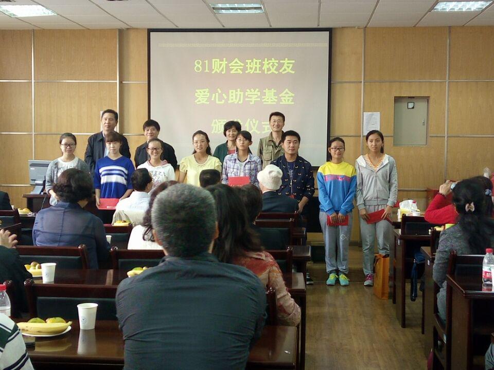 2015年10月17日星期六,81 级财会班校友在力行楼(9教)举行爱心助学基金捐赠仪式。会计学院2015级8名特困生受到了校友资助。
