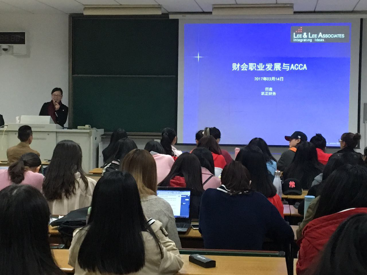 田鑫老师现任凯正财务会计经理,工作经验十分丰富。她分别从就业方向、个人软硬条件、职场生活和事务所招聘条件等几个方面展开分析,为我院在读ACCA方向班学生深入剖析了ACCA职业发展前景,极大了提高了学生对ACCA专业的认知和学习热情。期间,田经理还特意安排了互动环节,耐心地为同学们答疑解惑,并欢迎同学们在课外与她继续保持联系。需要特别指出的是,田经理当天虽然身体不适,但仍坚持到场,同学们为她的敬业精神报以真诚的感谢与热烈的掌声。