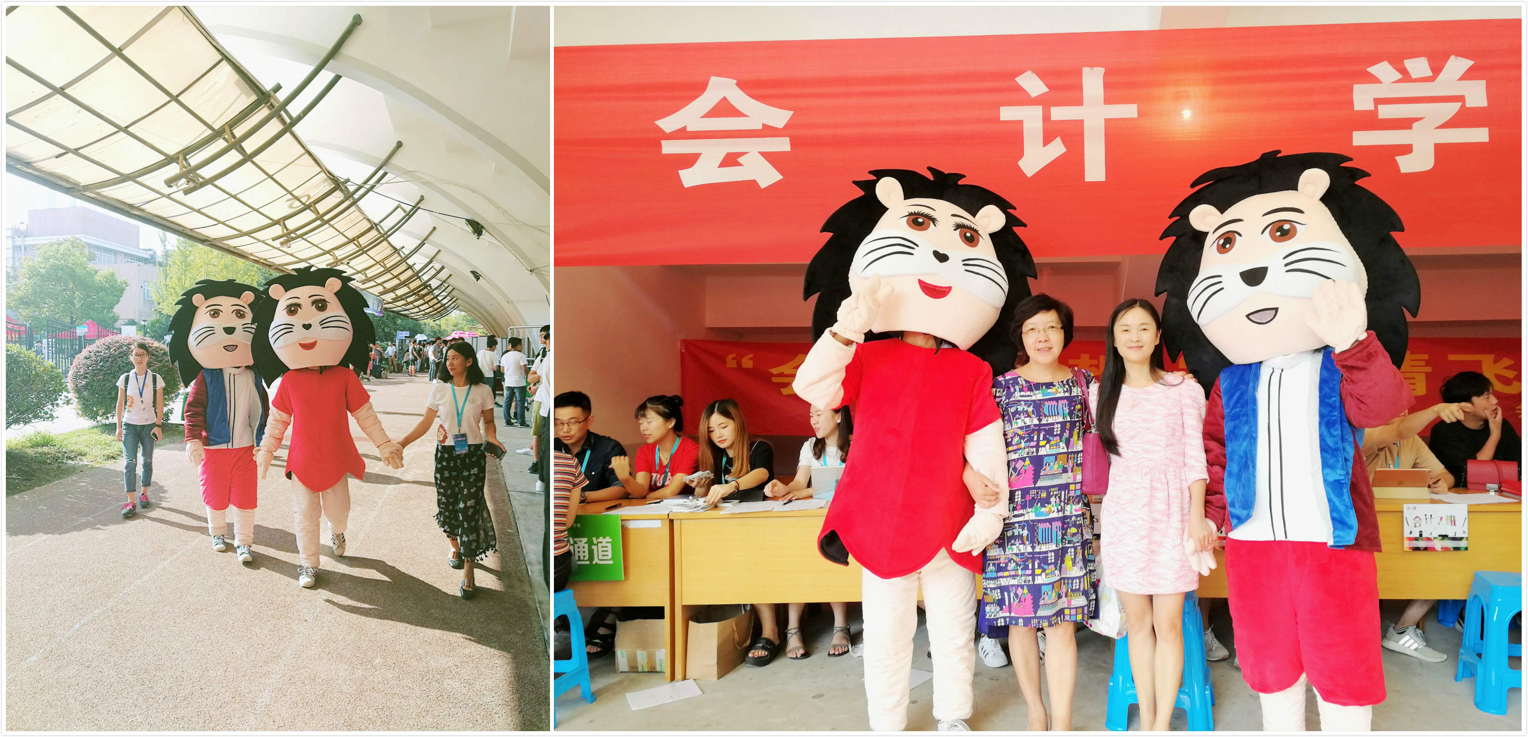 全程还有媒体工作人员负责拍摄照片、录像采访等记录活动过程,还特地采访了当日第一位报到的新生。为活跃现场气氛,工作人员还特地准备了人偶服,由专人负责穿戴表演,吸引无数目光。报到点现场还有会计学院特别定制的“会计狮”卡套、立牌与微信朋友圈式KT板,报到的新生纷纷积极与其合影。