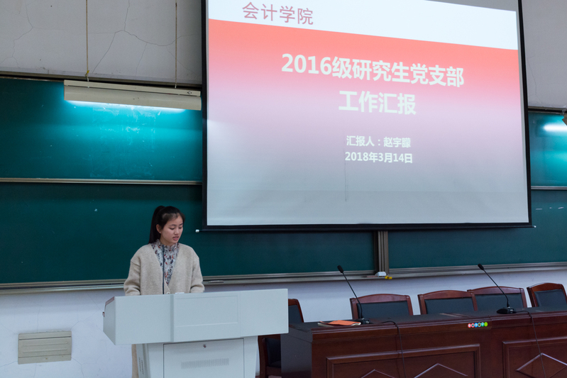 会上,会计学院党委副书记王秋兰老师部署了2018年度学院学生党建工作的安排,传达了全国两会和全会精神,要求全体学生党员深入学习“从严治党”的有关要求,根据《党章》的要求,认真落实“三会一课”制度,定期组织开展规范的党日活动,严格按要求参加组织生活,遵守各项纪律。会上,表彰了2017年度优秀共产党员和优秀党支部, 2016级研究生党支部书记赵宇朦同学代表做支部书记述职,展示了2017年度支部学习工作等。