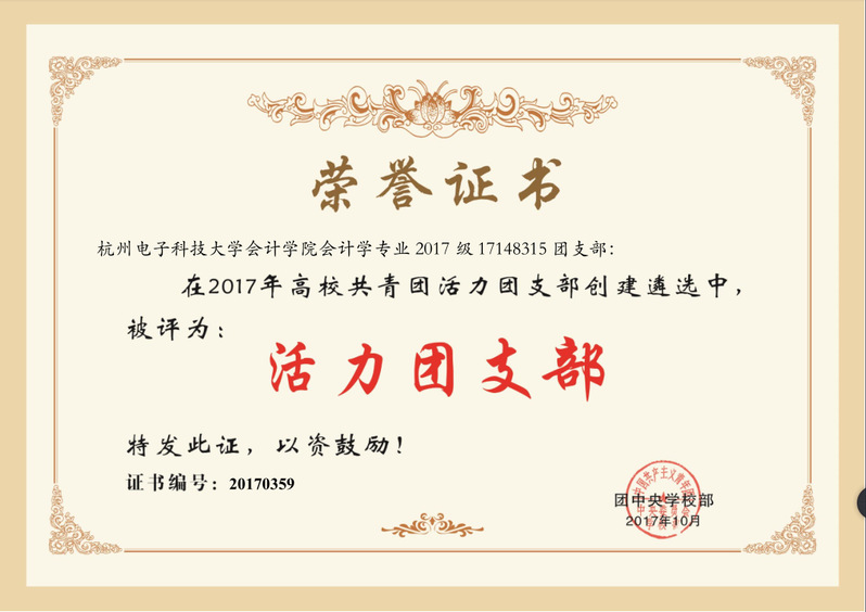 会计学院团委长期以来高度重视基层团组织建设,通过党建带团建,制度建设,健全完善团组织体系,推动基层团组织活力建设,取得了良好的效果,所属基层团组织多次获得各级表彰。2016年会计学院15140612班团支部荣获“全国活力团支部”称号,2017年会计学院17148315班团支部荣获浙江省“活力团支部”称号。