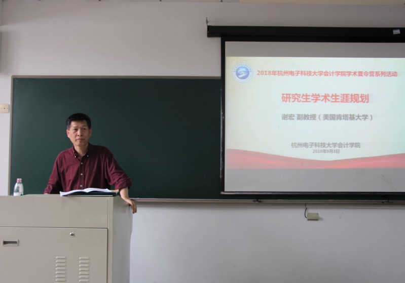 2018年6月3日,会计学院学术夏令营系列迎来了美国肯塔基大学的谢宏副教授,谢教授为学院全体研究生做了一场研究生学术生涯规划。谢老师认为生涯规划首先是要客观准确认识自己,通过心理学测试评估自己的兴趣、特性、特长,来确定自己适合的工作。如果对自己不满意,可以通过自己的努力在后天重塑自己。其次是要了解社会,我们同学很幸运生活在技术变革的时代,互联网给我们带来了诸多便利,物联网、5G新技术风起云涌,在我国经济发展势头良好的情况下,只要同学们努力,便能抓住机遇。