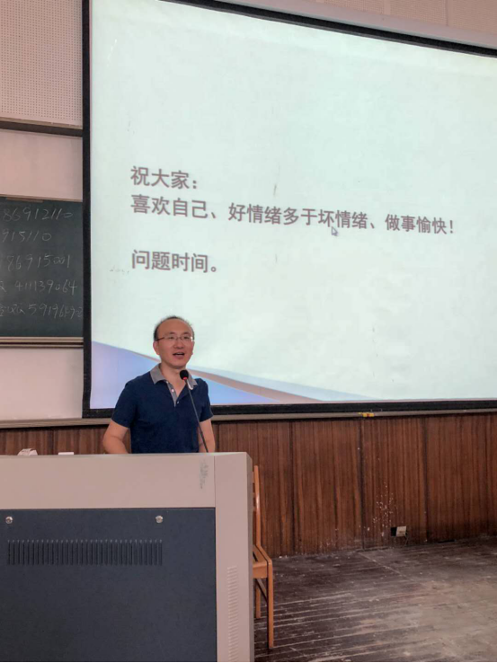 课程伊始,杨怀胜老师从“想法”、“情绪”、“行为”的心理学解释引入,并围绕这三个关键词展开讨论。杨老师首先就困扰许多大学生的“成就感”和“专注力”问题阐明看法,认为这两种感受是会随着大学生活的推移而不断改变的,其关键影响因素就在这三个词的变动上。随后,杨老师从专业的角度入手,教同学们如何分别从想法、情绪和行为角度“有效评估自己的心理状态”,并提出了可以从“吃得好不好,睡得好不好,拉得好不好”来简单评估一个人的心理健康情况。面对同学们可能出现的种种困扰和心理问题,杨老师建议同学们借向家人朋友倾诉、向专业人士咨询及运动疗法等途径排解困扰,不要避心理问题如避虎,而是应当积极地面对并寻求解决方法。紧接着,杨老师提出了几个保持身心健康的有效方法:一是每晚睡前想三件让你感到开心或有价值感或有成就感的事情,坚持一个月;二是每周评估自己的情绪状态,将情绪起伏列表分析;三是坚持“正念”,学会感悟生命的流动,活在当下。同学们听后都感触颇深、获益匪浅。最后,杨老师还向同学们介绍了校心理咨询中心的情况,并对同学们可能的来访表示了理解和欢迎。