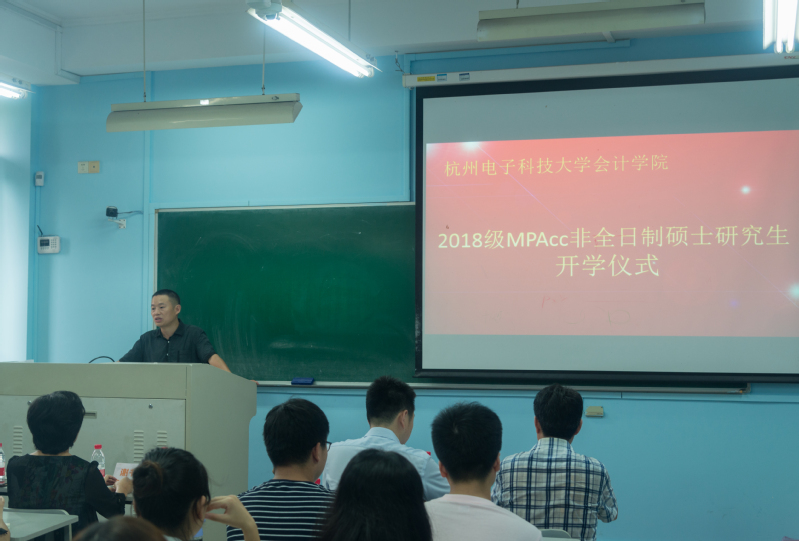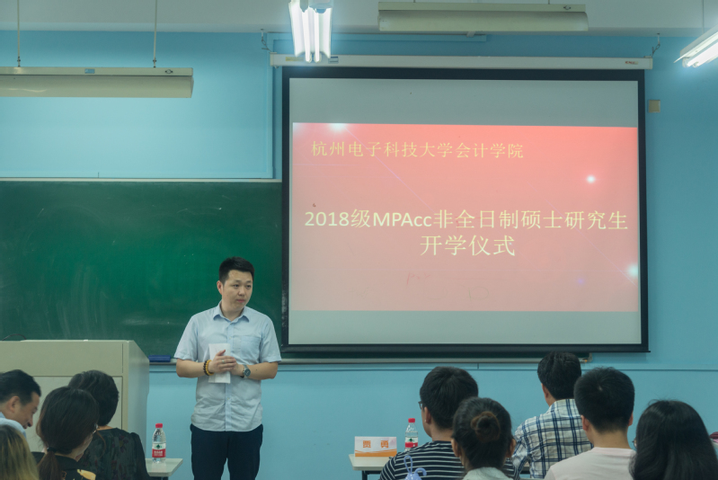首先,副院长贾勇在开学仪式上致辞,他介绍了杭电会计学院的悠久办学历史,是浙江省最早的财会人才培养单位之一,学院现有硕士生导师31名,其中包括4名博士生导师。然后向同学们介绍了学院对于会计专硕的培养目标是学术与科研并重,统筹全日制与非全日制研究生教育协调发展,坚持同一标准,保证同等质量,为了更好的培养会计硕士,学院还聘请70余名企业导师,帮助同学们更好的解决实际工作中的问题。同时,贾院长表达了对非全日制研究生的希冀,希望同学们可以安排好学习、工作和家庭,在读研期间进一步提高自己发现并解决问题的能力,树立研究生期间的目标,积极参加MPAcc案例分析大赛并及早准备在核心期刊上公开发表论文。