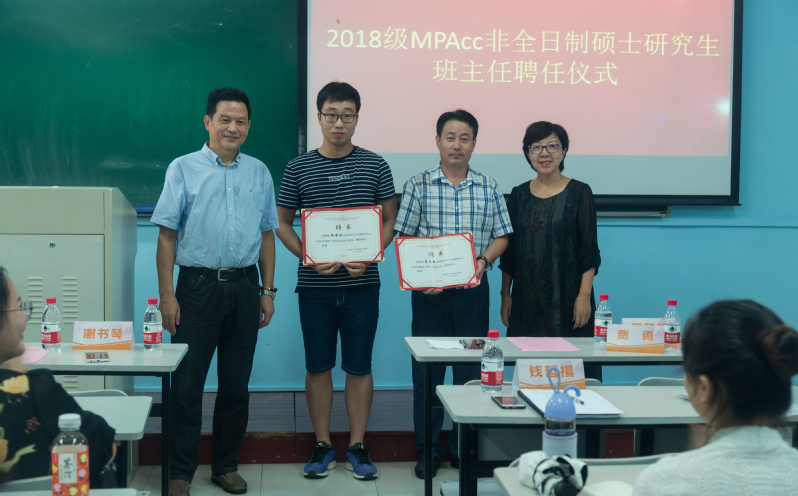 随后进行了非全日制MPAcc硕士研究生班主任和班主任助理聘任仪式,为了更好的服务非全日制研究生,学院聘请易颜新教授为班主任,由谢书琴书记和周克俭处长颁发聘书并合影留念。