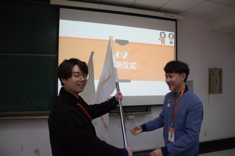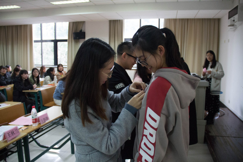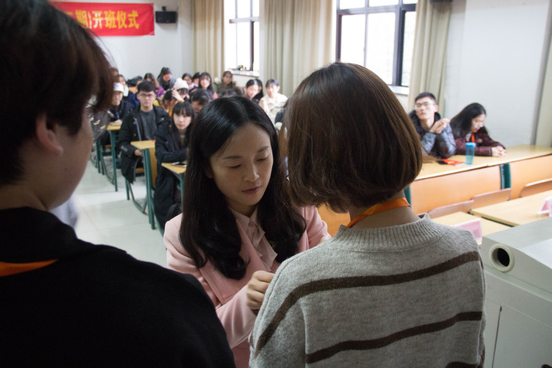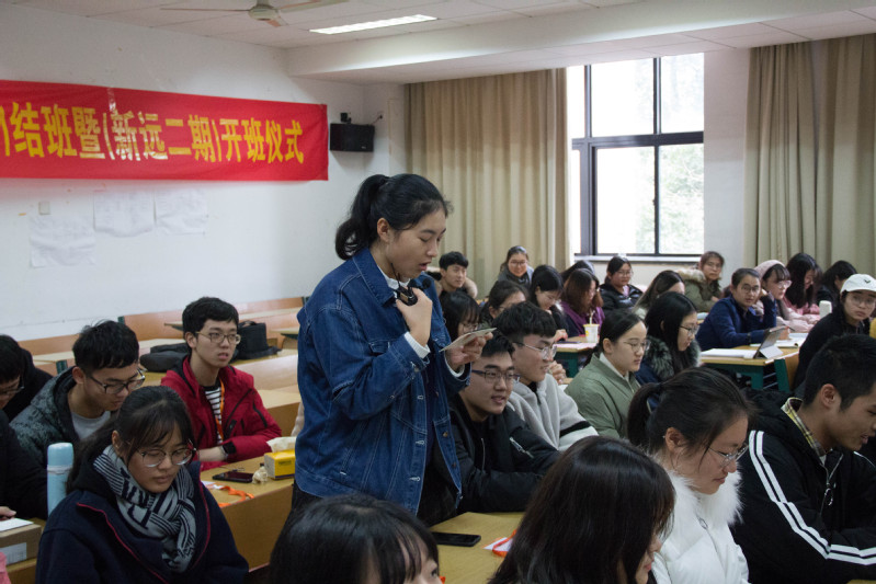 随后,新远二期开班仪式开始,新老学员代表上台交接,完成了对新远班班旗的接力传承;王秋兰老师、汪瑾斌老师和芦月老师三位老师来到台上,亲手为二期学员代表佩戴班徽。仪式前,新远一期的学员们为二期学员准备了写有他们亲身体会和亲笔祝福的明信片,这些明信片被随机地发放到了每一位二期学员的手中。在主持人的倡议下,二期学员们踊跃起身发言,和大家共同分享他们收到的暖暖心意。