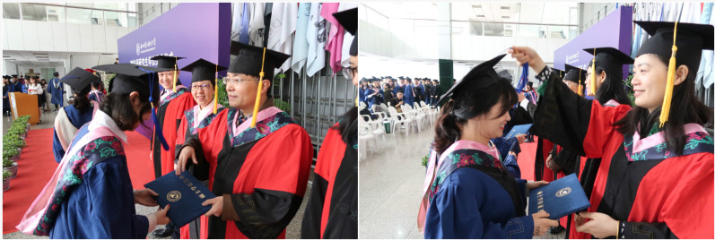 经学校学位评定委员会全体会议审议通过,决定授予会计学院53名同学硕士学位。毕业生们依次踏上红地毯,由五位老师组成的“主礼嘉宾”小组亲切地为学生们拨过硕士帽上的流苏,祝贺他们圆满完成学业。吴卿副校长为毕业生一一授予学位证书并与他们合影留念。仪式结束之时,各位老师与毕业生一同拍摄集体照,留下这难忘的时刻。