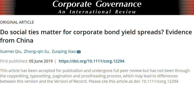 日前,肖作平教授、苏忠秦副研究员以及肖作平教授指导的博士研究生邱雪妹共同撰写的学术论文“Do Social Ties Matter for Corporate Bond Yield Spreads? Evidence from China”被公司治理领域国际权威期刊Corporate Governance: An International Review录用(https://doi.org/10.1111/corg.12294)。