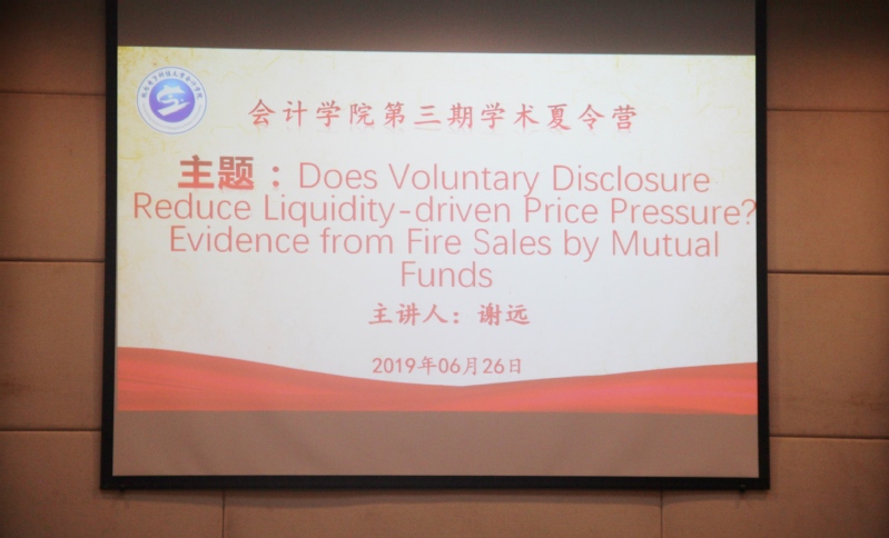 6月26日上午,我院在科技馆扇形会议室开展了第三期学术夏令营的第四场专题讲座,由谢远教授就“fire sale slides”主题作了精彩分享。本次讲座由苏忠秦副院长主持,会计学院老师以及研究生参加了本次讲座。