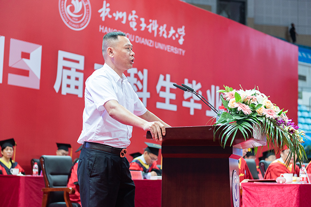 6月26日上午,杭州电子科技大学2019年本科生毕业典礼暨学位授予仪式在下沙校区隆重举行。校领导王兴杰、朱泽飞、朱斌、薛晓飞、郑宁、牛东红、吕金海、徐江荣、吴卿,各学院党政负责人,相关职能部门负责人,教师、辅导员、班主任代表,企业嘉宾、校友代表,以及毕业生家长代表等出席毕业典礼,毕业典礼由校党委副书记薛晓飞主持。仪式上,我院2019届毕业生家长林武先生代表全体学生家长在全校毕业典礼上发言。
