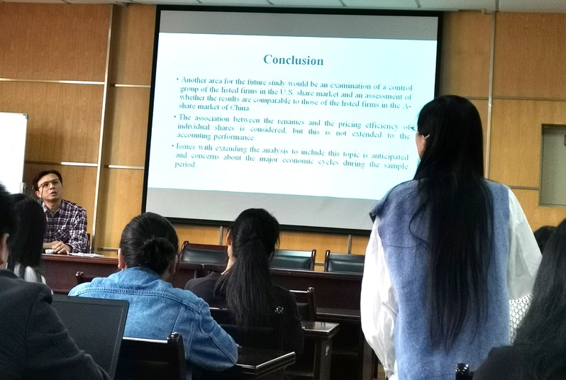 10月9日下午,我院在9教230开展了第二期学术沙龙活动,由苏文宏老师就《The Impact of Renames on Pricing Efficiency of Individual Shares》作了精彩分享,会计学院老师以及研究生参加了本次活动。