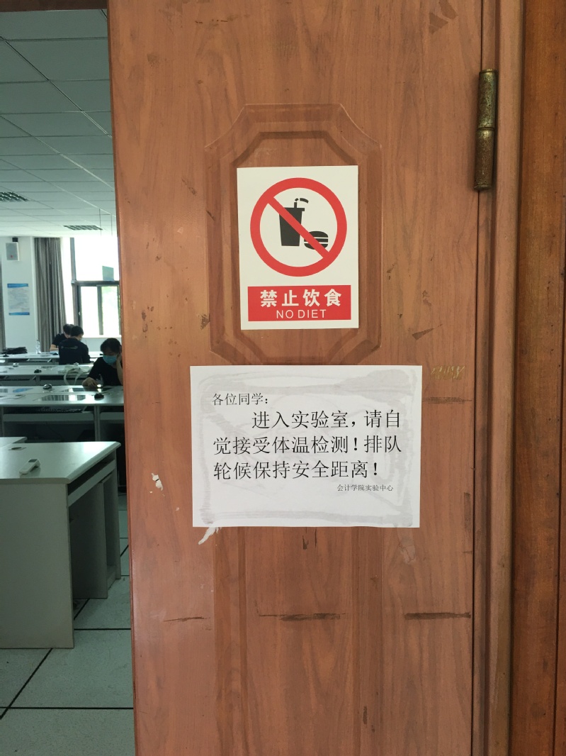 相关措施包括:编制《会计学院实验中心疫情防控期间的使用说明》,提前对实验室管理人员、实验室任课教师进行疫病防疫和应急处理相关的培训;统一在实验室门口张贴防疫注意事项标贴,统一测温进入实验室;调整实验室座位的间隔和布置,严格执行“一人一座,隔位就坐”,严格控制实验室内人员数量;建立疫情期间实验课程登记制度,明确教师职责,要求任课老师授课期间及时提醒学生执行实验操作流程及情况登记;根据实验主管部门的相关要求,安排值班人员,做好每日定时消杀及通风,保障实验环境卫生安全。