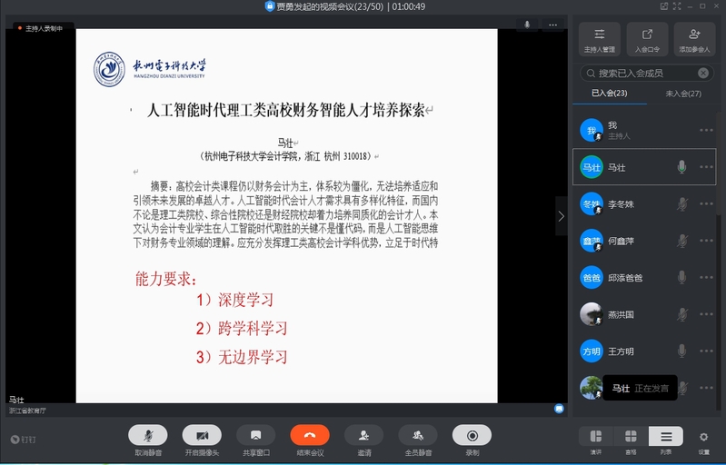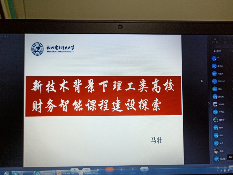 6月12日晚7点,会计学院在钉钉平台开展了教学分享活动,贾勇副院长主持了活动,马壮老师以《新技术背景下理工类高校财务智能课程建设探索》为主题进行了分享,会计学院其他老师参加了本次活动,并结合分享主题进行了深入交流和研讨。