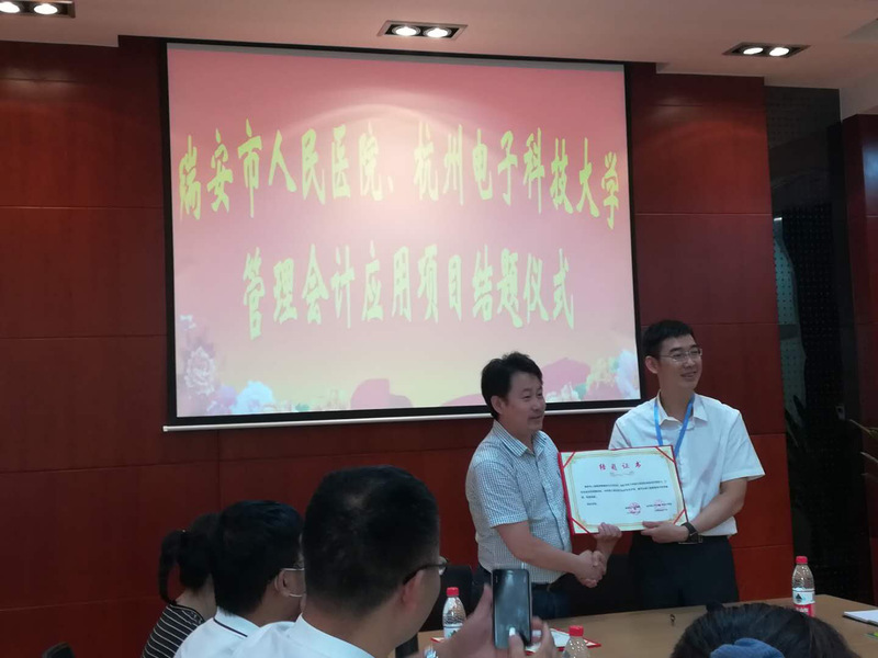 会议伊始,瑞安市人民医院就2016-2018年的管理会计项目举行结题仪式,总会计师陈民与易颜新教授合影留念。