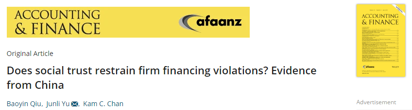 近日,我院邱保印副教授的学术论文Does social trust restrain firm financing violations? Evidence from China发表于国际SSCI重要期刊ACCOUNTING AND FINANCE(JCR 二区)。
