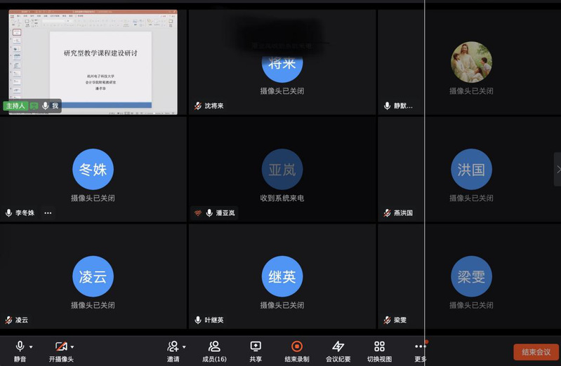 2022年4月20日下午,我院举办了研究型课程教学建设研讨会。由于疫情原因,本次研讨会通过钉钉线上举办。本次会议由财税教研室潘孝珍老师介绍研究型课程教学和建设情况,会计学院15位教师参与本次研讨会。