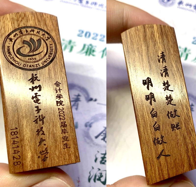 副书记贾鹏飞老师向毕业生代表颁发了学院精心准备的毕业礼物:学院独家定制的刻着每位同学名字的“清廉印章”和一本《毕业生清廉修身手册》。这枚“清廉印章”由会计学院精心设计和制作,印章正面刻着学校的校名校徽以及学生的学号,反面刻着“清清楚楚做账,明明白白做人”的会计准则。《毕业生清廉修身手册》由会计学院的老师和大学生骨干班“新远班”的同学们共同设计,内容主要包括“致毕业生的一封信”“职务犯罪小科普”“警示案例放心头”“法律法规不可忘”“清廉文化大盘点”等六部分组成,以丰富的案例为线索,教导即将走上会计工作岗位的毕业生自我监督,廉洁从业。
