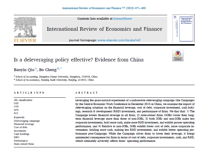 近日,我院邱保印副教授的学术论文Is a deleveraging policy effective? Evidence from China 发表于国际SSCI重要期刊International Review of Economics and Finance。