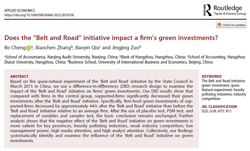 此外,我院邱保印副教授(通讯作者)的学术论文Does the “Belt and Road”initiative impact a firm’s green investments?发表于国际SSCI重要期刊Applied Economics。