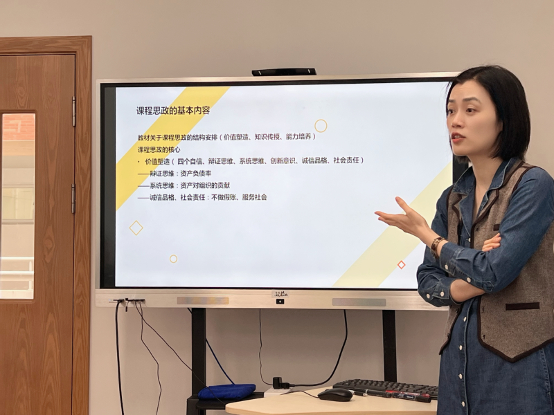 随后,由浙江省课程思政课程《财务分析》课程负责人程颖老师面向会计学院骨干教师进行了课程思政背景下财务类课程的教学经验分享。程老师首先基于财务类课程的特点,论述了课程思政的核心以及教学中如何体现辩证思维、系统思维、创新意识以及社会责任;其次可以基于中国上市公司实际情况开展案例教学,具体包括案例教学的目的、案例素材的来源、教师的准备工作等等;最后基于成本管理会计等专业课程的具体教学,探讨了课程思政的具体开展。