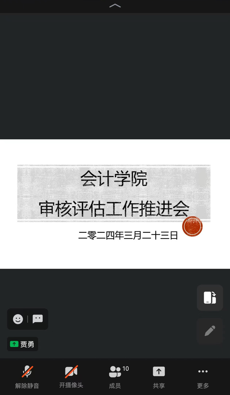 会计学院于2024年3月23日18:30召开本科教育教学审核评估工作推进线上会议,学院领导、各系(中心)负责人和教科办人员参加,会议由会计学院副院长贾勇主持。