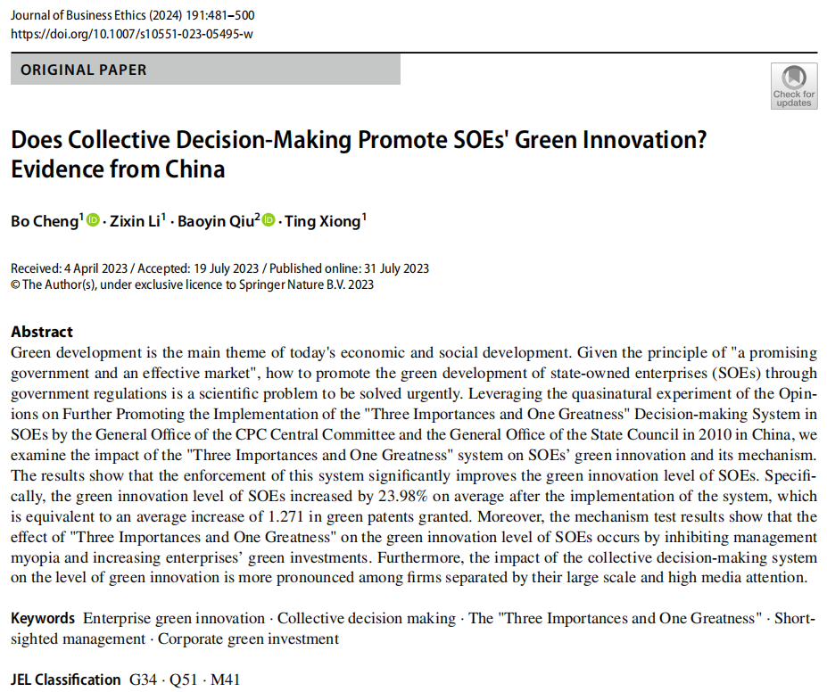 近日,我院邱保印副教授以通讯作者身份在Journal of Business Ethics期刊发表学术论文“Does Collective DecisionMaking Promote SOEs' Green Innovation? Evidence from China”。Journal of Business Ethics创办于1965年,是商业伦理领域的权威期刊,是英国《金融时报》(Financial Times)认定的50本全球经管类国际高水平学术期刊之一(简称FT50),中科院TOP,近五年影响因子为8。