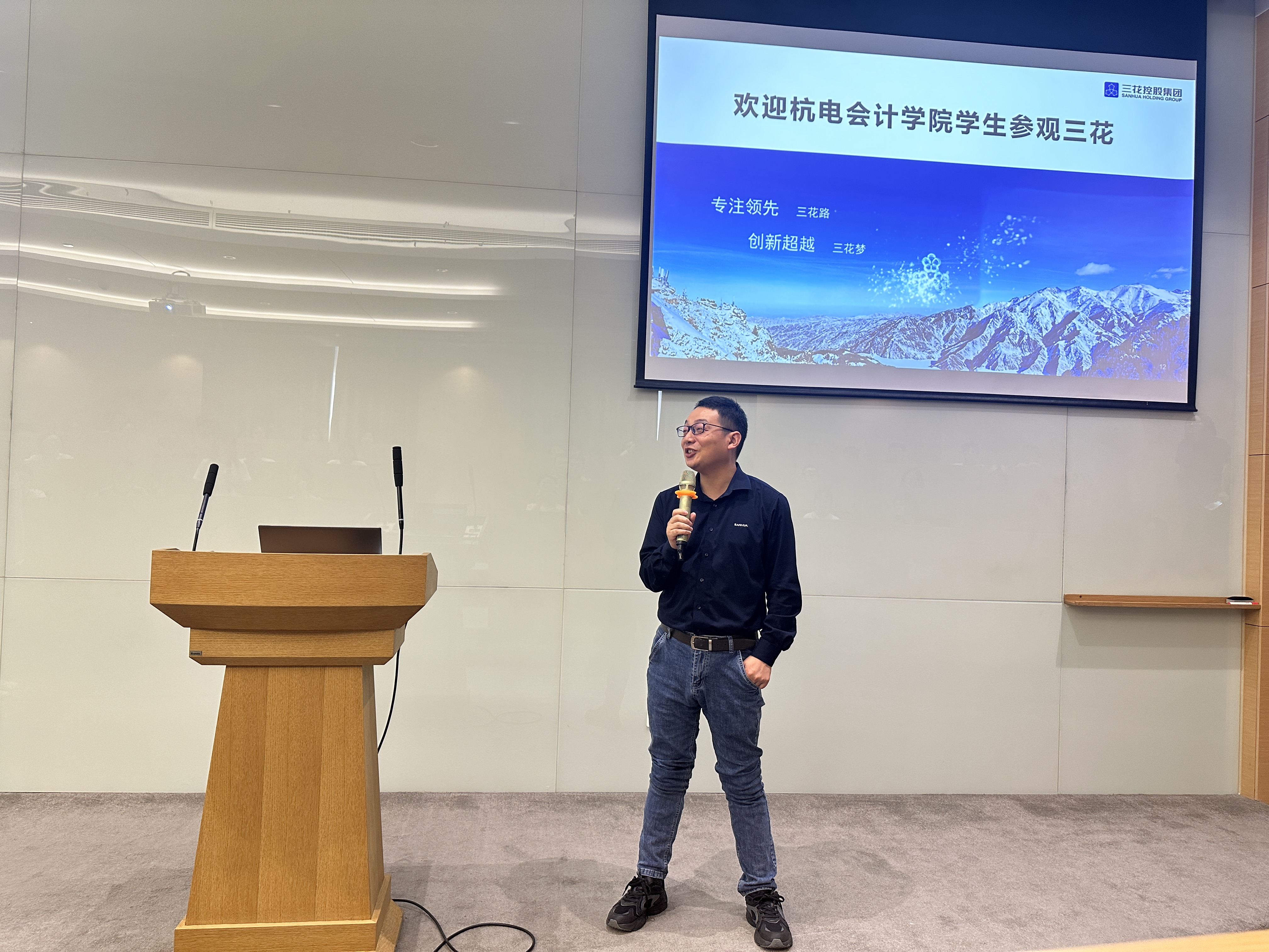 首先,三花汽零财务副总监叶总分享了他工作15年的心路历程。叶总本硕毕业于杭州电子科技大学会计学院,作为学长,叶总见到学弟学妹们非常亲切。叶总从三花集团概况、全球布局、财务组织架构、财务人员的成长之路、财务人员通用发展通道、成本管理是财务人员的必备能力以及在三花工作下的一点感悟等多个方面与同学们做了推心置腹的分享。在问答环节,同学们踊跃提问,叶总鼓励大家大学期间要学好专业知识,在实际工作中要多问、多做、少说,专业能力与本地业务管理相结合。企业看重的能力是思维能力、逻辑能力、获取新知识的能力。财务人员要时刻关注质量、时间、成本这三者的平衡。