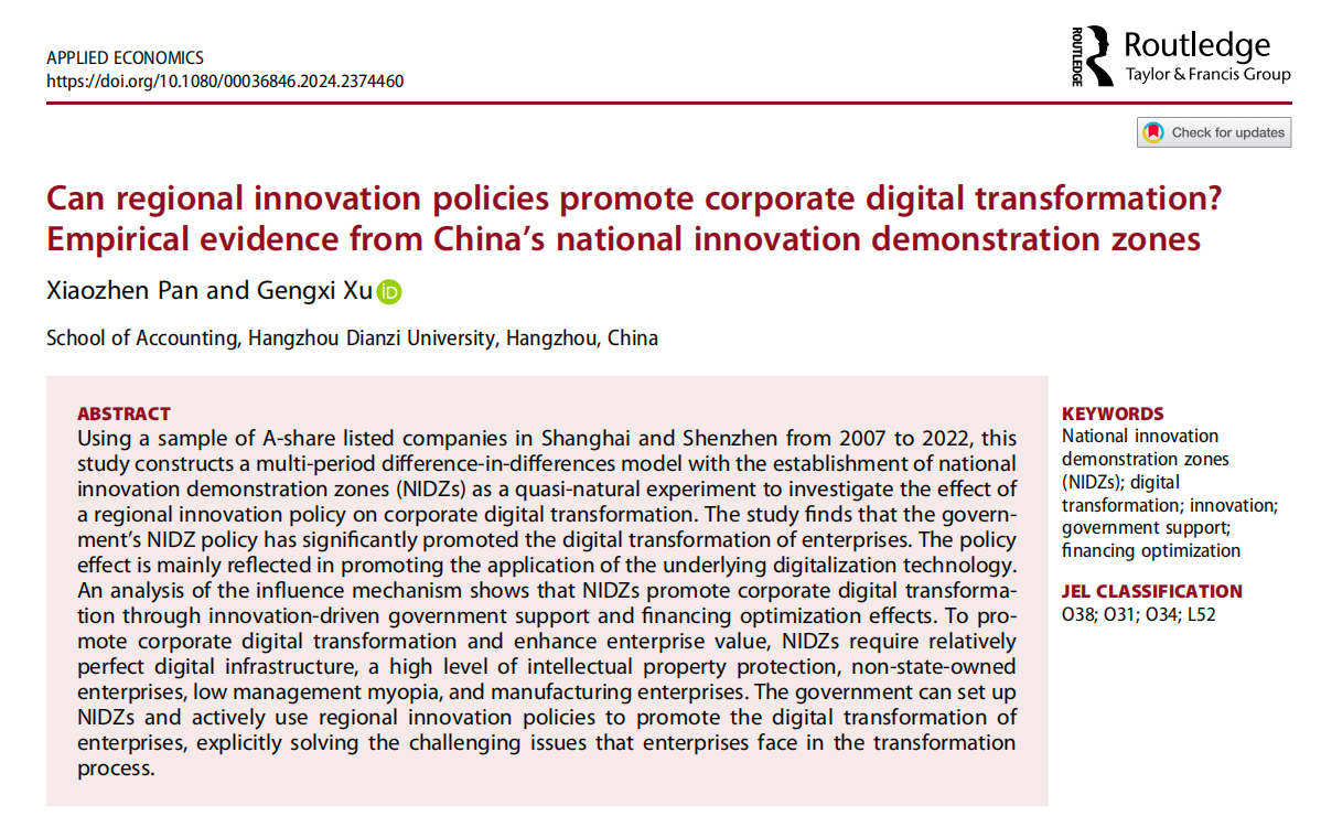 近日,我院潘孝珍教授和硕士研究生许耿熙同学在SSCI二区期刊Applied Economics发表学术论文“Can regional innovation policies promote corporate digital transformation? Empirical evidence from China’s national innovation demonstration zones”。