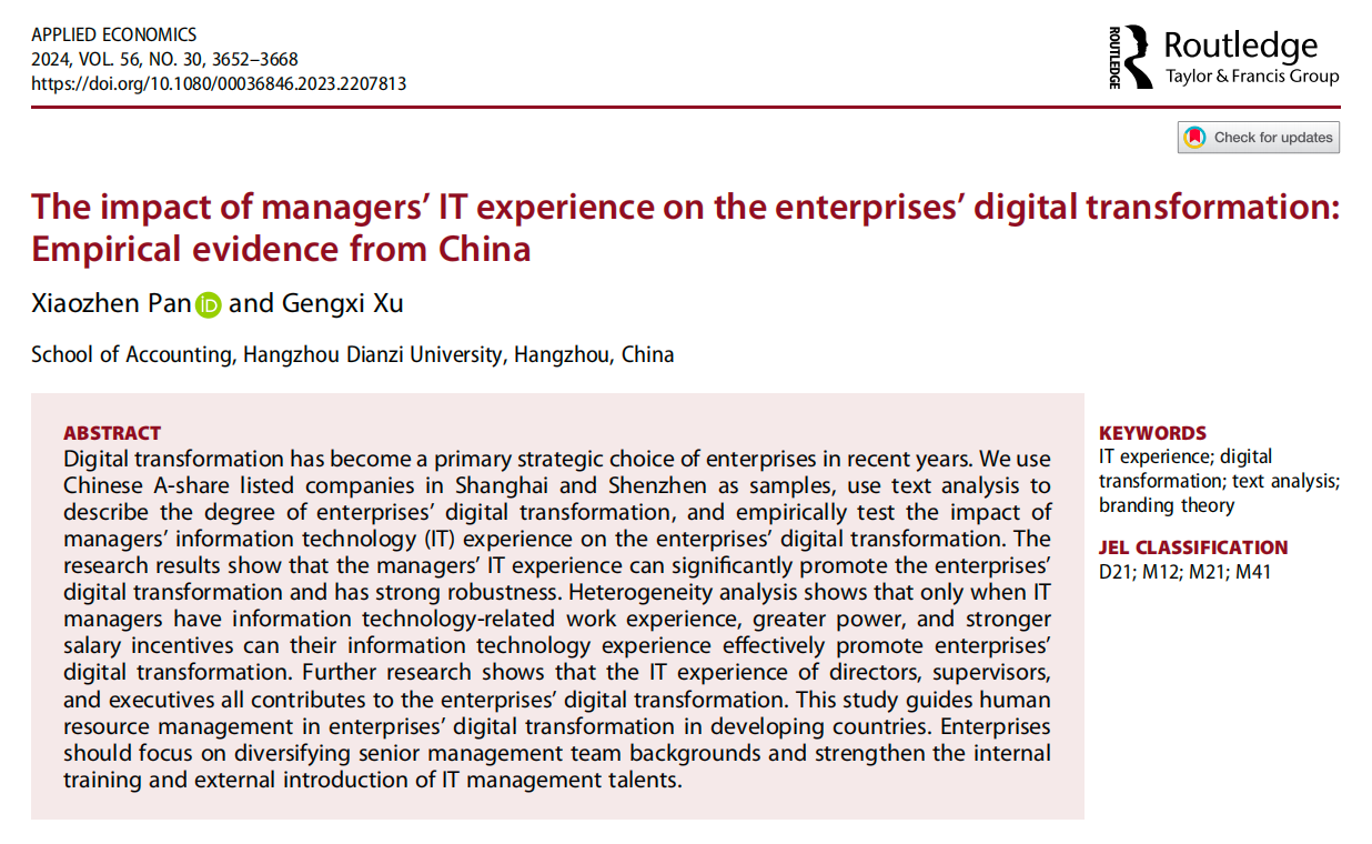 近日,我院潘孝珍教授和硕士研究生许耿熙同学在SSCI二区期刊Applied Economics发表学术论文“The impact of managers’ IT experience on the enterprises’ digital transformation: Empirical evidence from China”。