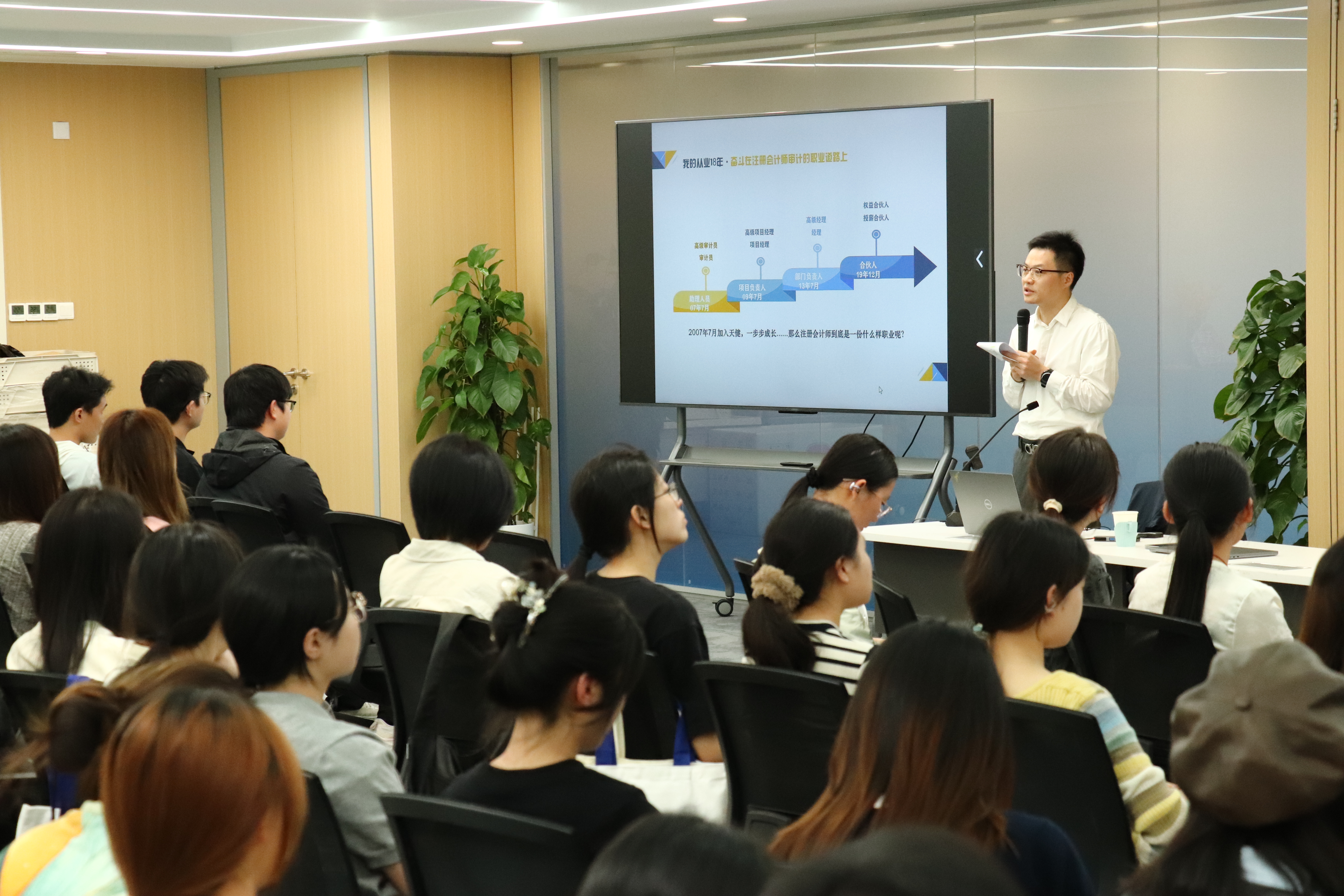 接着,天健合伙人罗联玬先生分享了他自2007年7月加入天健,18年从业生涯和工作、生活感悟。罗总展示了部分服务客户,包括上市公司、国企发债以及新三板挂牌公司,很多是我们耳熟能详的知名企业。继而,他分享在天健职业成长晋升路径:助理人员——项目负责人——部门负责人——合伙人,天健的晋升路径是很明晰的,他个人晋升到合伙人用了12年。随后,罗总还分享了注册会计师这份职业的挑战性,他从抗压能力、职业风险、专业能力、协调能力多个角度做了解析,并通过展示他从业以来的部分获奖荣誉以及服务的企业成功上市的精彩画面,生动诠释了注册会计师也是一份富有成就感的职业。最后,罗总介绍了天健的员工福利和团建活动,包括工会活动、女工活动、党团活动、国内外旅游等。