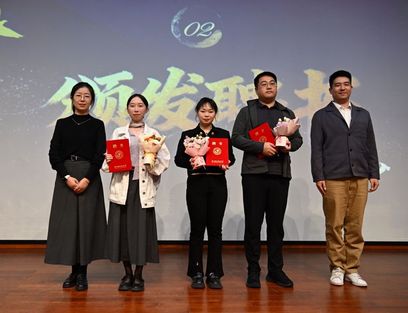 盖玉洪、金冠舟为三位校友颁发聘书并献花,期待校友们能为学院人才培养、学生实践指导提供更多支持。