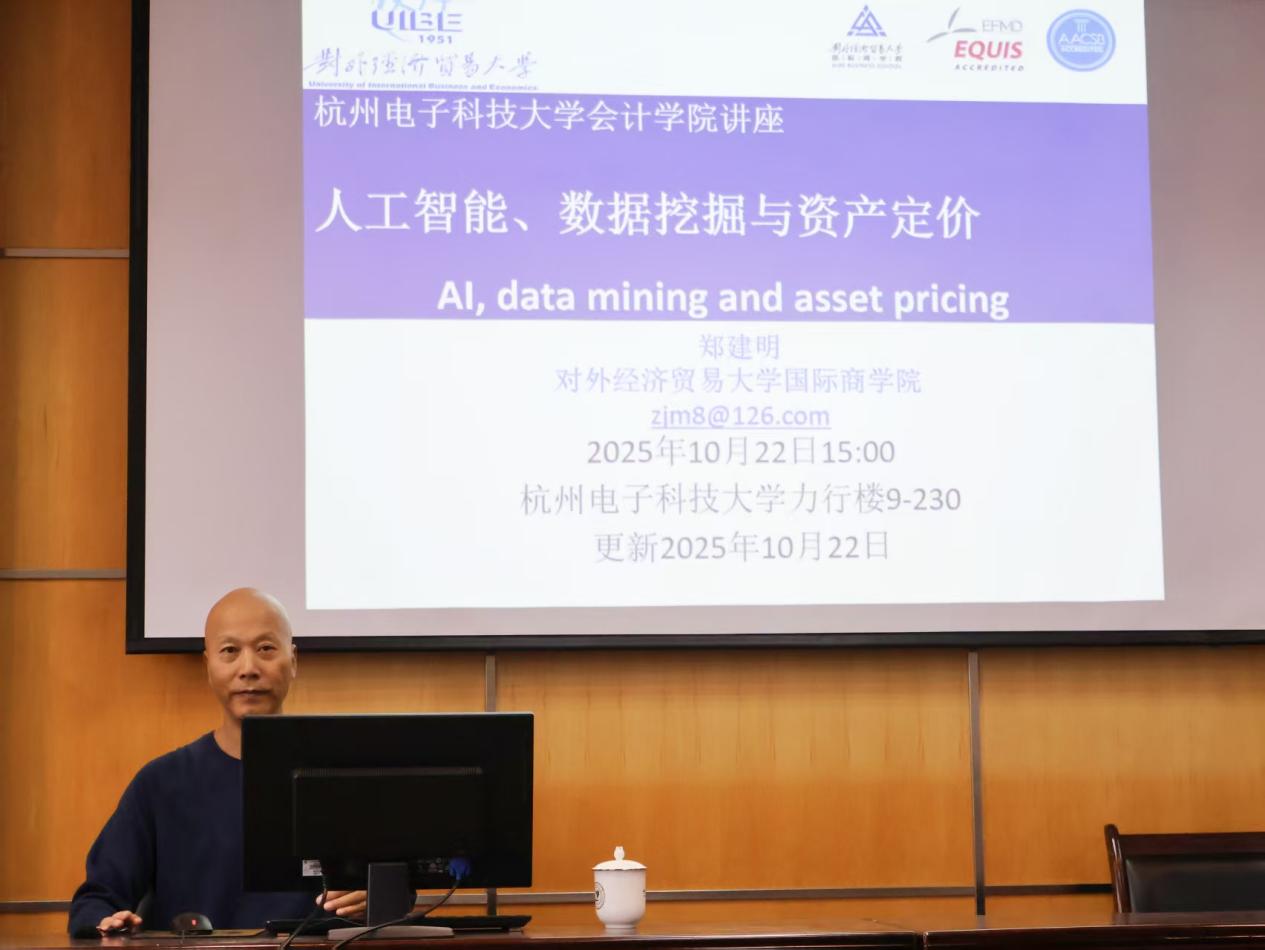 2025年10月22日下午,一场以《人工智能、数据挖掘与资产定价》为主题的学术讲座在杭州电子科技大学第九教研楼230教室顺利展开。本次讲座特邀对外经济贸易大学国际商学院郑建明教授担任主讲,为会计学院师生深入剖析了人工智能技术为财务与资本市场带来的前沿变革。