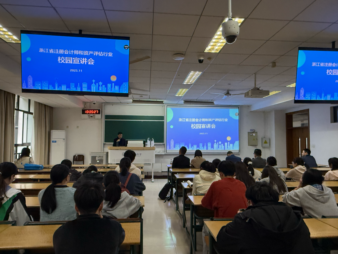2025年11月11日下午,浙江省注册会计师和资产评估协会组织的首场校园宣讲会在杭州电子科技大学顺利举办。浙江省注册会计师协会副秘书长夏烨能、天健会计师事务所合伙人周晨、立信会计师事务所浙江分所合伙人张建新、中审华会计师事务所浙江分所副所长金红霞、天源资产评估有限公司副总经理顾桂贤、会计学院副院长贾勇出席宣讲会。