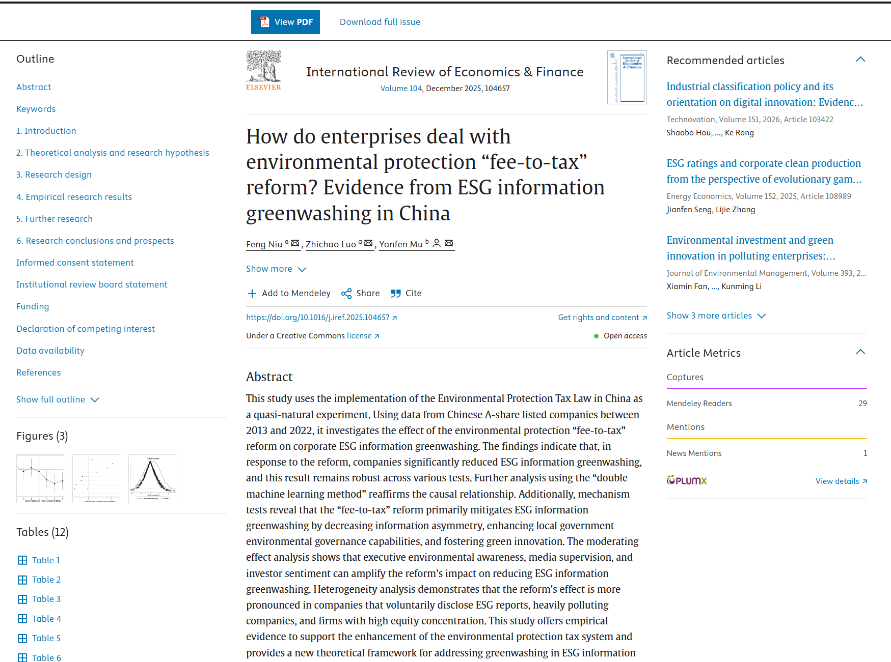 近日,我院牛枫副教授在国际知名学术期刊International Review of Economics & Finance发表学术论文 “How do enterprises deal with environmental protection ‘fee-to-tax’ reform? Evidence from ESG information greenwashing in China”。International Review of Economics & Finance目前属于SSCI JCR一区期刊,ABDC A类期刊。IREF旨在发表具有高质量原创性的理论和实证研究,最新影响因子为 5.6。