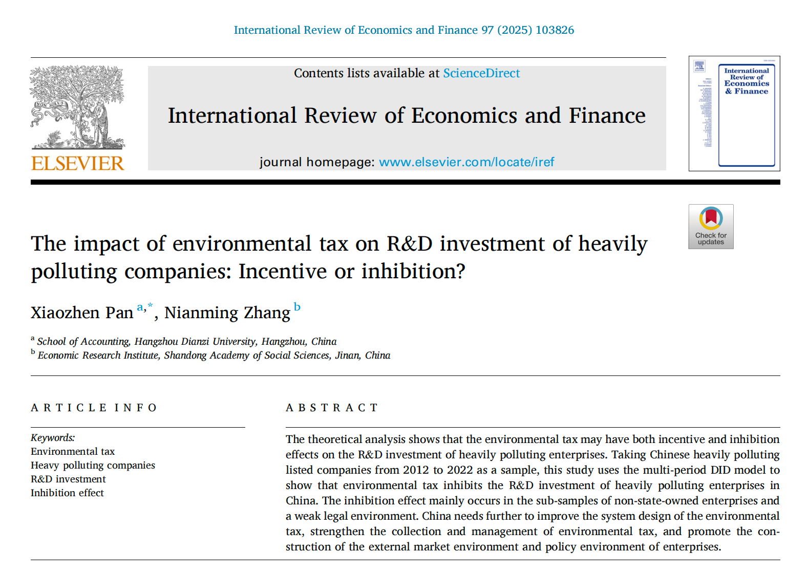 近日,我院潘孝珍教授和合作者在International Review of Economics & Finance期刊发表学术论文“The impact of environmental tax on R&D investment of heavily polluting companies: Incentive or inhibition?”。International Review of Economics & Finance属于SSCI一区期刊,近五年影响因子为5.5。