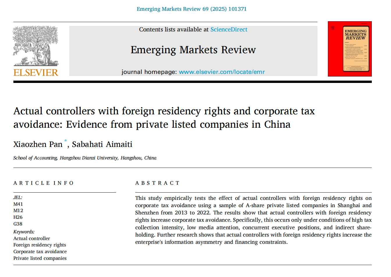 近日,我院潘孝珍教授和萨巴哈提·艾麦提同学在Emerging Markets Review期刊发表学术论文“Actual controllers with foreign residency rights and corporate tax avoidance: Evidence from private listed companies in China”。Emerging Markets Review属于SSCI一区期刊,近五年影响因子为5.1。萨巴哈提·艾麦提同学是潘孝珍教授指导的2023级税务专业硕士研究生。