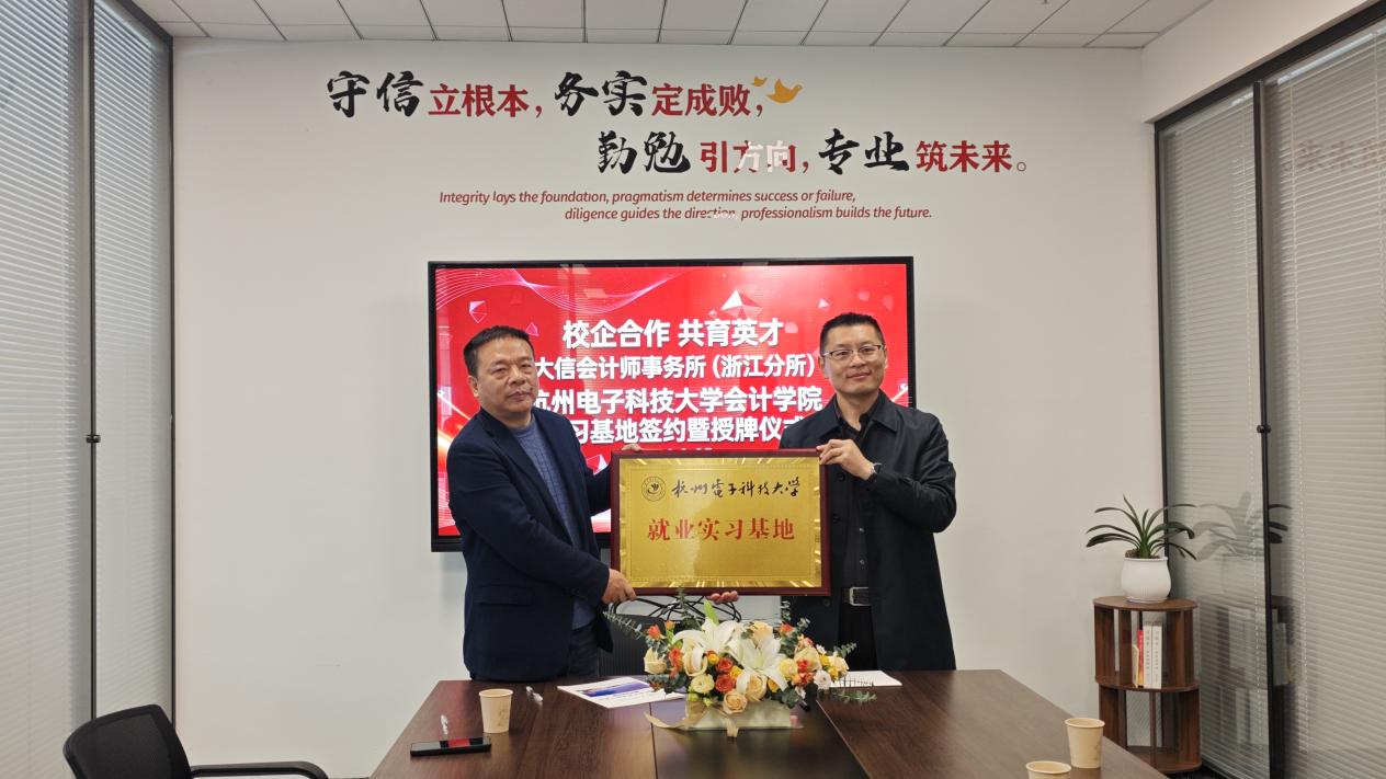 2026年3月25日下午,会计学院与大信会计师事务所(特殊普通合伙)浙江分所举行学生实习基地授牌仪式,校企携手搭建实践育人新平台。会计学院党委副书记贾鹏飞、学工办主任郦剑英、退休教师王方明带领学生代表一行出席活动,双方围绕人才培养、实习实训、就业对接等核心内容开展深入交流,达成长期合作共识。